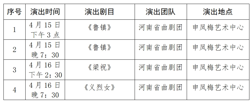 本台讯 4月15日至16日,“中原文化大舞台” 将在周口市申凤梅艺术中心为广大市民带来4场精彩纷呈的经典剧目演出,演出团队为河南省曲剧团。具体演出安排如下: