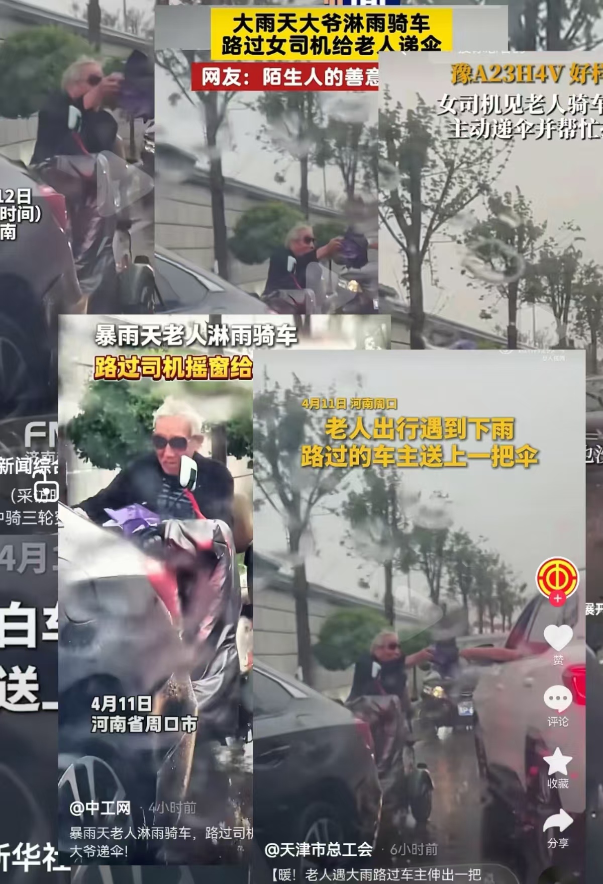 4月11日下午,周口遭遇暴雨突袭。令人动容的一幕悄然上演:一位老人骑着电动车冒雨艰难前行,浑身早已被雨水浇透,在风雨中显得格外无助。此时,一辆车牌号为豫A23H4V的白色私家车缓缓驶过,迅速拿出一把雨伞,从车窗递给了老人。然而,老人接过伞后仍无法成功撑开,车主再次摇下车窗,帮老人打开雨伞,她才驾车离去。这温暖的瞬间,被后方车主袁帅用手机记录了下来。