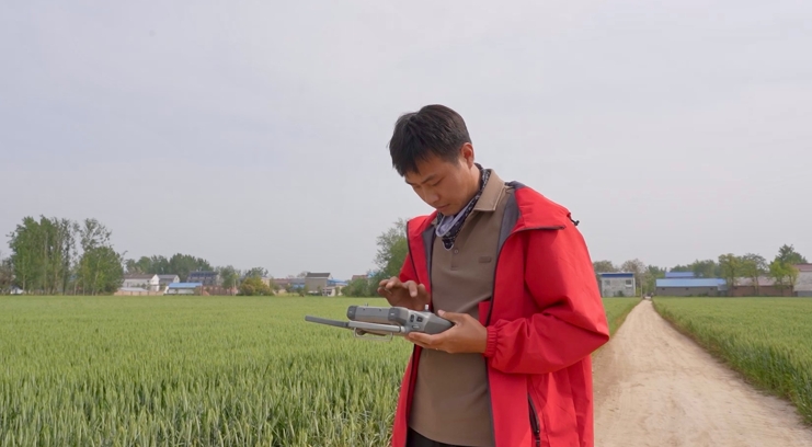 在太康县杨庙乡祁楼村的麦田里,种粮大户王彬彬正在熟练地操作植保无人机开展飞防作业。