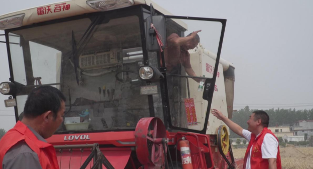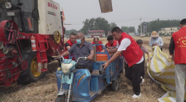 麦收现场,党建小分队的成员们身着红马甲,与农户们并肩作战,联系调配收割机,协助农户搬运、装载麦子,为农机手和农户们送去饮用水、防暑药品等物资,提供贴心服务。
