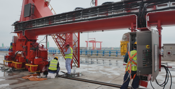 在码头设备安装调试现场,第二台岸桥和三台岸桥正逐个检测调试中,现场负责人向记者介绍了他们如何与降雨“躲猫猫”。