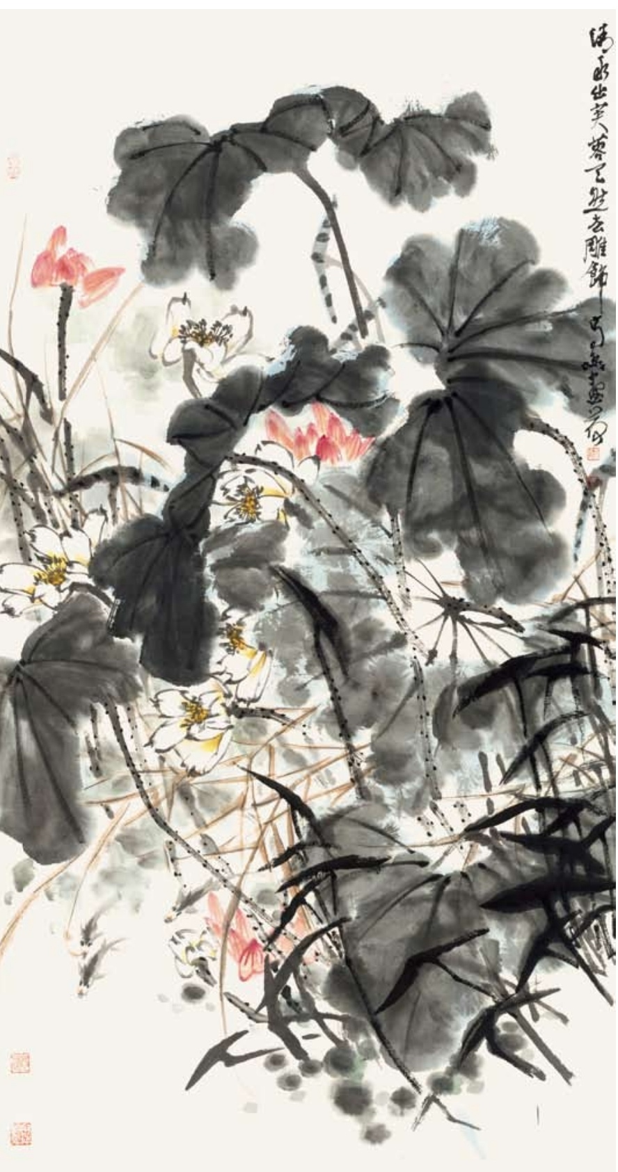 该作品集集中展示了高磊以泼墨写意为主的荷花作品。其作品用笔大胆、构图独到,在古淡悠然中尽显清雅流畅的意趣。高磊先生工写兼擅,更注重融古汇今,既蕴含篆书的古典气质,又融合了如吴昌硕、潘天寿等近现代大师的金石气与霸悍风骨,营造出静中寓动的画面节奏。