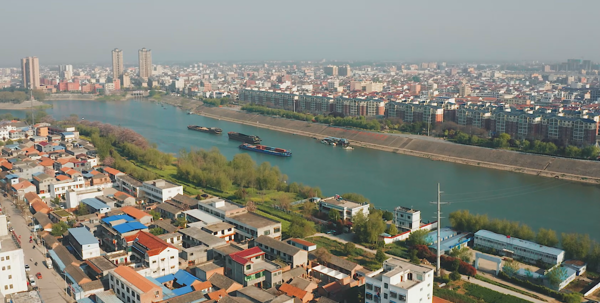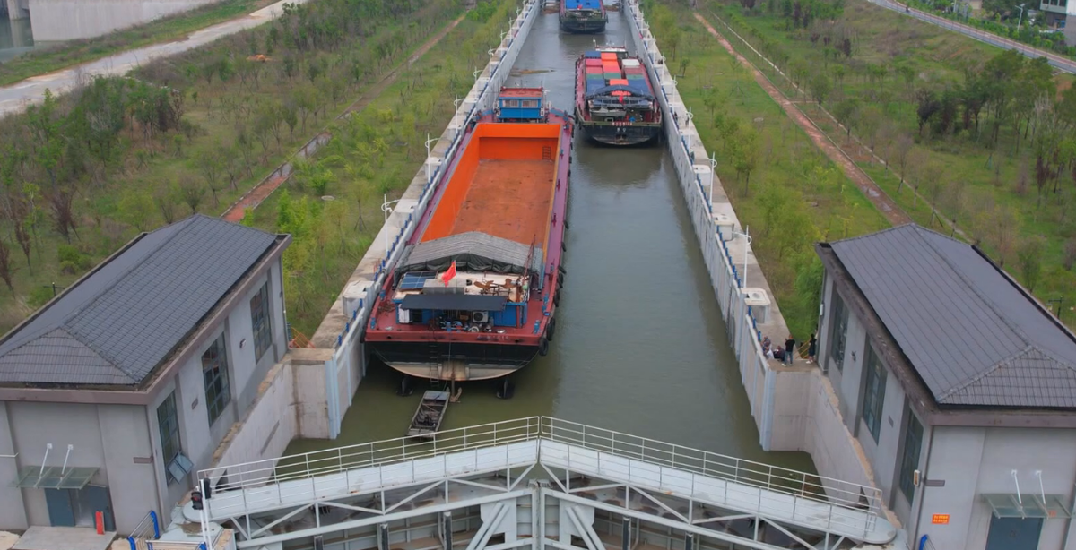周口广电融媒记者沈琳桂:“我现在所在的位置是沈丘航运枢纽船闸,在我身后大家可以看到,一艘艘货轮正在有序通过闸口,这也标志着河南省首个千吨级船闸正式通航。”