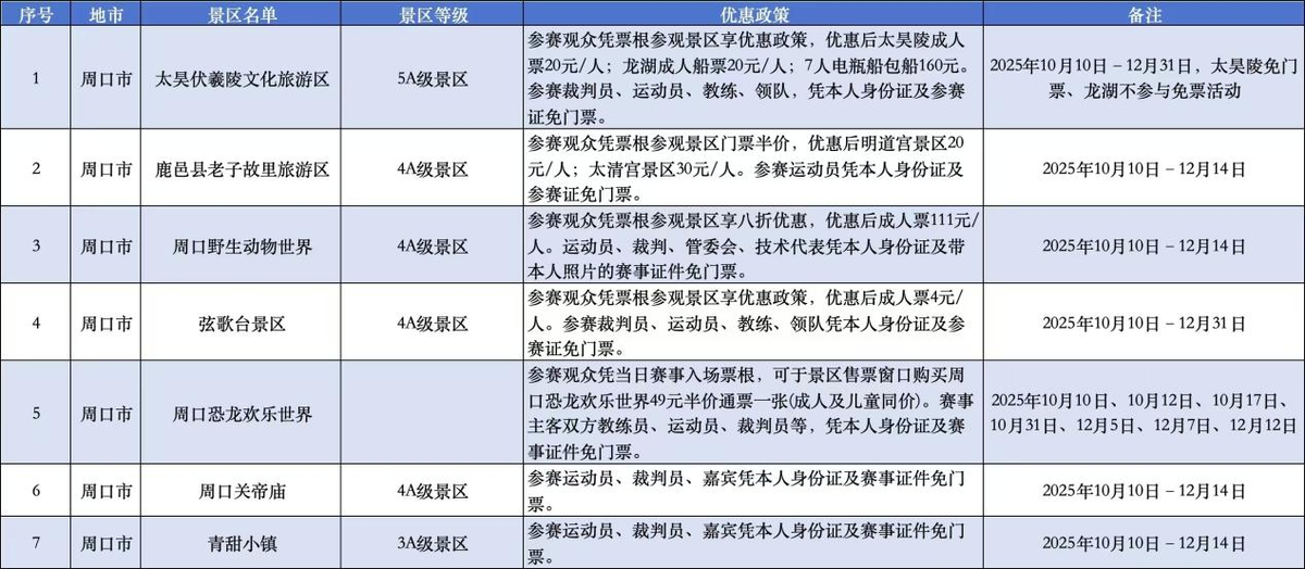 为更好地践行“体育+旅游”的融合发展思路,让“赛旅融合”的理念落地生根,周口市在赛事同期精心策划了一系列文旅惠民活动。届时,凡是参与本次赛事的运动员、教练员、领队、裁判员,以及手持有效观赛门票票根的观众,都能凭借相关的身份证明,在周口全市范围内的多家重点旅游景区享受门票折扣或专属特色服务。
