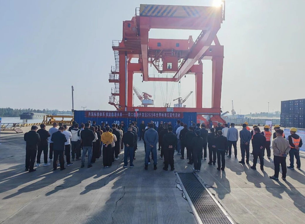 本台讯 为大力实施“标准周口”战略,扎实推进省级内河航运物流枢纽服务标准化创建工作,凝聚政企多方共识,推动“经济通道”向“通道经济”转变,10月14日,周口临港开发区以2025年世界标准日为重要契机,在周口港范营作业区举办“共筑标准体系赋能临港未来”世界标准日宣传活动。周口市临港物流发展中心全体工作人员、周口市市场监督管理局港航分局、周口临港开发区内运营企业、物流企业代表等共同参与活动,政企协同汇聚起标准化建设的强大合力。
