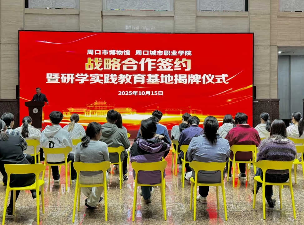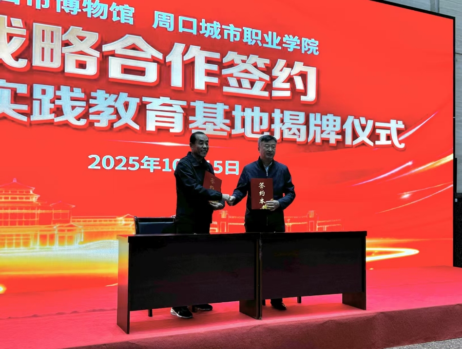 本台讯 10月15日,周口市博物馆与周口城市职业学院战略合作签约暨研学实践教育基地揭牌仪式举行。这标志着双方在馆校合作、智慧融合与文物活化利用方面迈出关键一步,将以深度挖掘周口历史文化资源为核心,共同推动文化事业与教育实践协同发展。