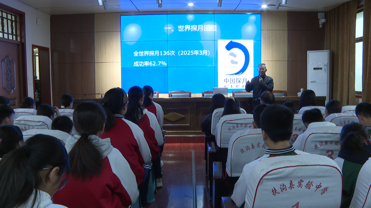 本台讯 10月16日,由周口市教育局、市科协联合主办的“少年与科技——科学家科普巡讲进校园”主题巡讲活动走进扶沟县,中科院老科学家科普演讲团成员、西安卫星测控中心研究员朱民才教授,受邀为当地实验中学的两百名学生带来一场《“嫦娥”探月成功密码》的主题讲座。