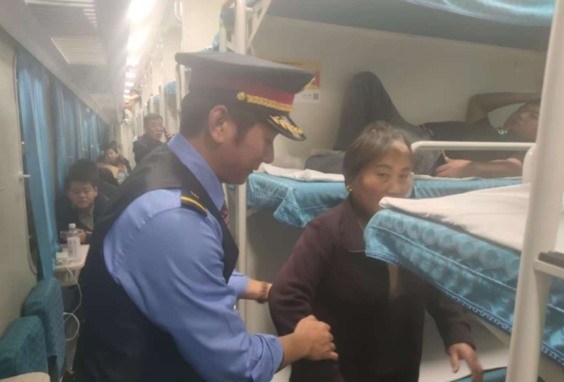 10月14日,北京西站人流如织。陈大娘腿部刚做完手术与家人回长葛,由于卧铺车票紧张只买到一张中铺,面对爬梯一筹莫展,家人也束手无策。正在巡视的列车长吴玉怀了解原委后,一边安抚老人,一边搀扶她先到车厢过道就座,并协助家属安置行李。