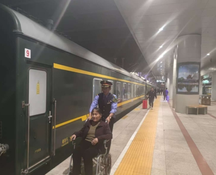 15日6时36分,列车驶抵长葛站。吴玉怀下车托住陈大娘的胳膊,与家属一同将她搀扶下车,并与车站工作人员顺利交接。