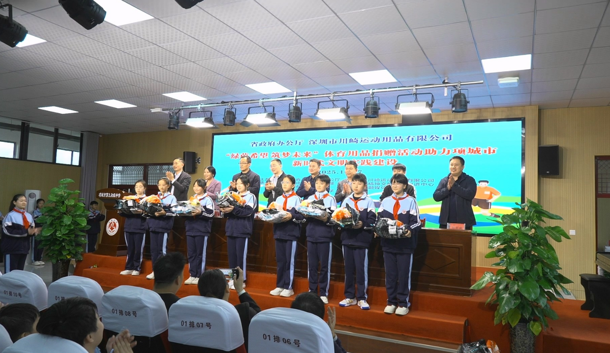 本台讯 近日,省政府办公厅携深圳市川崎运动用品有限公司赴项城调研指导新时代文明实践工作,并在项城市第九初级中学同步开展“绿茵希望 筑梦未来”体育用品捐赠公益活动。