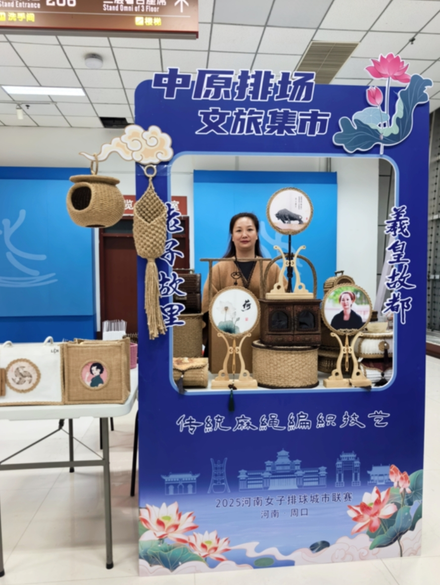 豫排联赛期间的“文旅集市”上,李春红带着麻绳作品惊艳亮相。她给观众耐心讲解编织的过程,让大家在动手实践中触摸非遗温度。为契合体育赛事主题,她特意赶制“三鱼同首”主题团扇、提包。