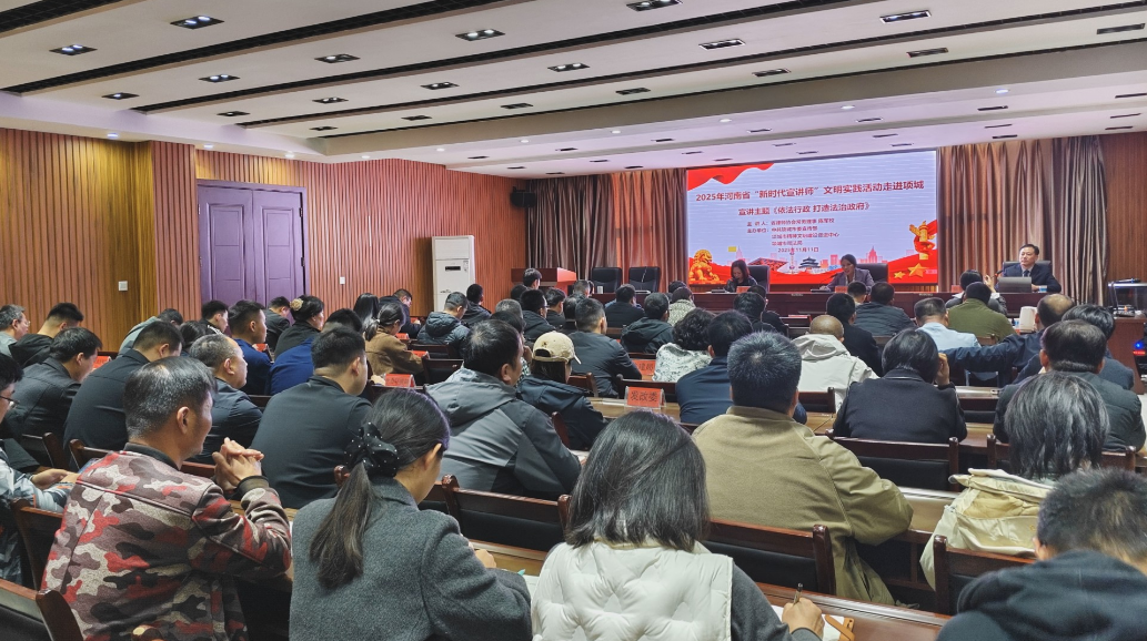 本台讯 11月11日下午,2025年河南省“新时代宣讲师”文明实践活动走进项城。本次宣讲以“依法行政 打造法治政府”为主题,由河南省新时代宣讲师、河南省律师协会刑事法律专业委员会主任、河南前行律师事务所主任陈军校主讲,为项城市相关单位及21个镇(街道)一线执法人员送上了一份内容翔实的“法治大餐”。