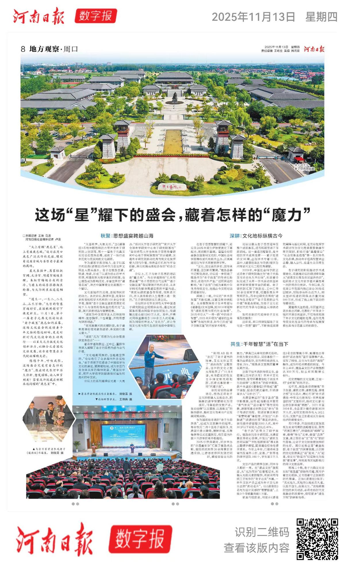 本台讯 近日,第十一届老子元典文化论坛在“老子故里”周口鹿邑启幕,这场文化盛会既延续着千年文脉的悠远回响,更是对新时代文化使命的生动践行——以星火之力激发文化创新活力,以融合之姿深化文旅发展,让古老智慧在当代绽放璀璨光芒。11月13日,《河南日报》以《这场“星”耀下的盛会,藏着怎样的“魔力”》为题,对相关情况进行了报道。