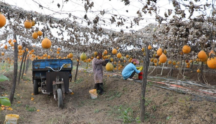 走进丁村乡刘营村的百亩瓜蒌种植基地,只见整齐的支架上瓜蒌藤相互缠绕,一个个金灿灿的瓜蒌果像小灯笼挂满枝头,个个体态饱满。村民们穿梭于藤蔓下,精心挑选采摘成熟的瓜蒌,处处洋溢着丰收的喜悦。