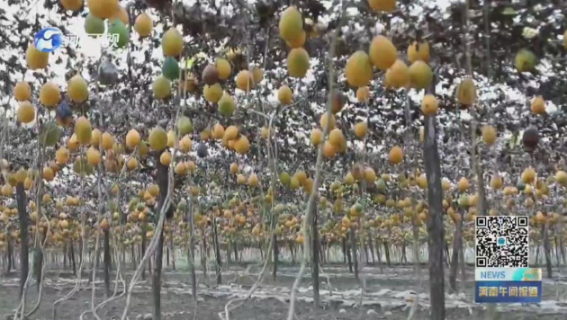 在周口郸城县丁村乡刘营村的百亩瓜蒌种植基地,整齐的支架上瓜蒌藤相互缠绕,一个个金灿灿的瓜蒌果像小灯笼挂满枝头。