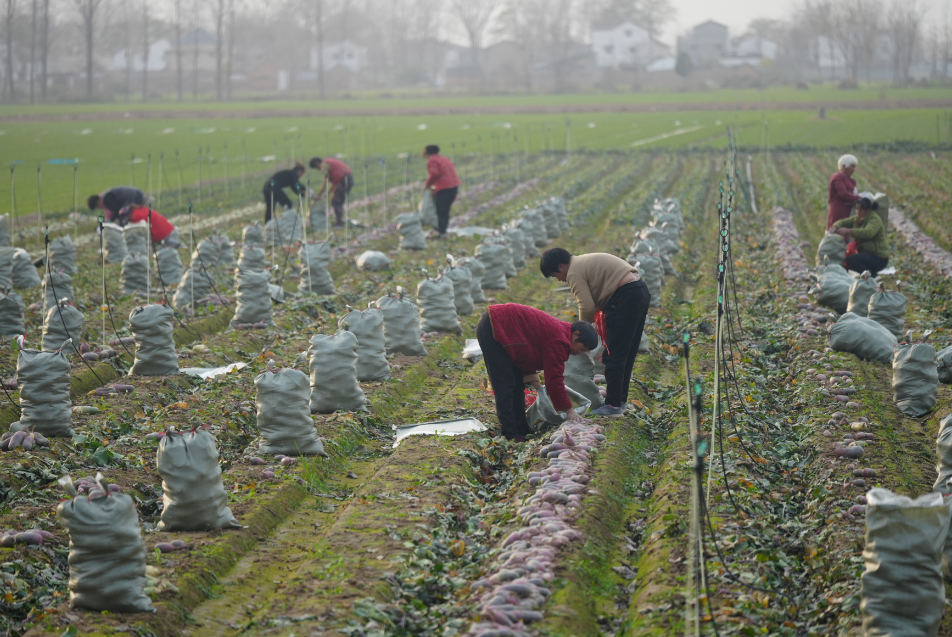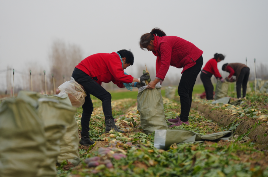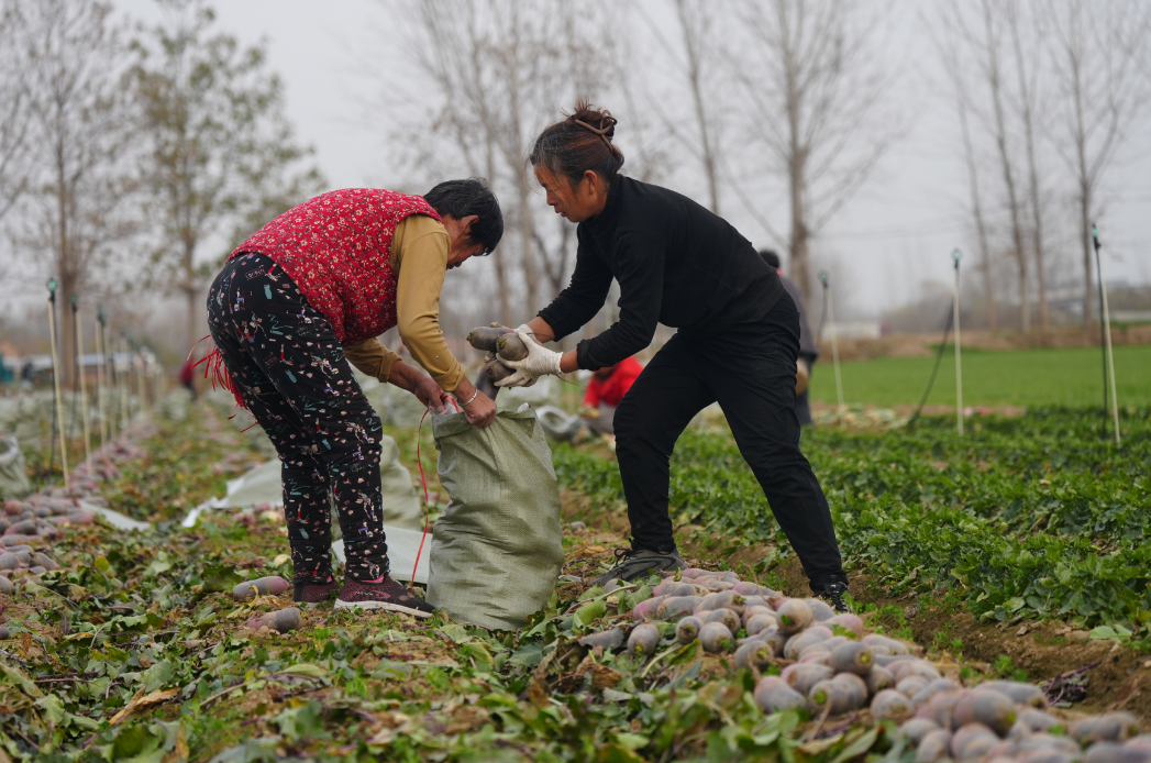 日前,淮阳区临蔡镇常庄村的省级生态农场——吴金锋种植家庭农场内,一百余亩水果萝卜迎来采收季,几十名工人忙着拔萝卜、装袋、打包,一派丰收景象。“萝卜哥”吴金锋正给客户介绍自家萝卜,他随手拿起一个通体紫色的“冰淇淋萝卜”,用刀轻轻一划,萝卜“咔嚓”裂开,露出青色的果肉与紫色的芯。