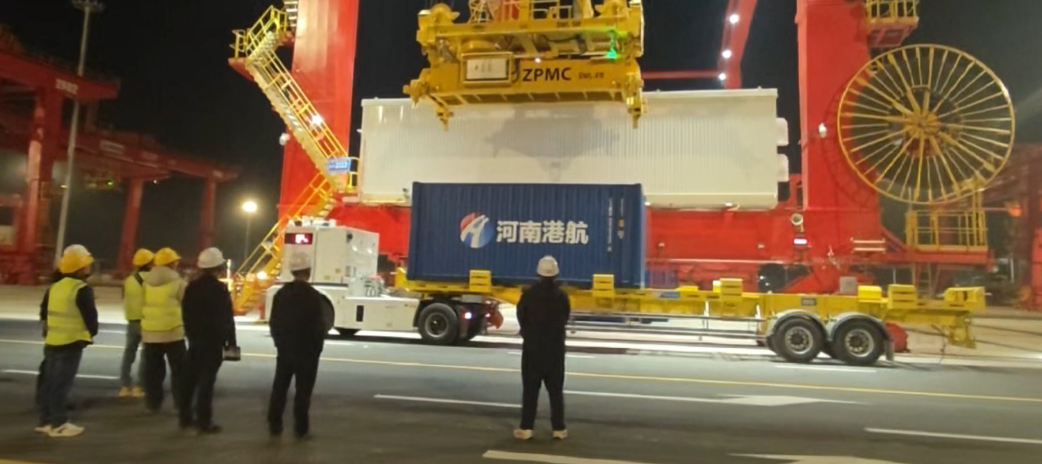上海振华重工周口港港机设备安装现场负责人李磊说: “现在我们正在调试无人集卡与岸桥的自动对位,我们的集装箱的尺寸与集卡拖车的尺寸,对接的精度要达到厘米级,所以我们要反复地试验、反复地测试,才能够保证以后运营的装卸效率能够达到最理想的状态。”
