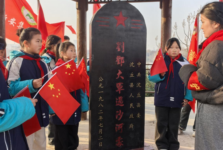 本台讯 12月10日,在第十二个国家公祭日来临之际,沈丘县新安集镇下溜小学在下溜古渡口“刘邓大军过沙河处”石碑前,开展“红韵下溜·渡忆峥嵘”主题研学活动。