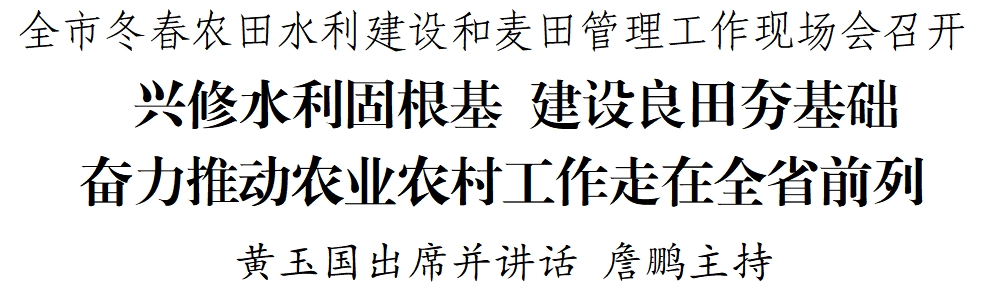 本台讯 12月12日,全市冬春农田水利建设和麦田管理工作现场会在商水召开,深入学习贯彻习近平总书记在河南考察时重要讲话精神和关于“三农”工作、治水兴水的重要论述,全面落实全省冬春农田水利建设和麦田管理视频会议部署,分析研判当前形势,安排部署重点任务,扎实推进今冬明春农田水利建设和麦田管理等重点工作。市委书记黄玉国出席并讲话。市长詹鹏主持。