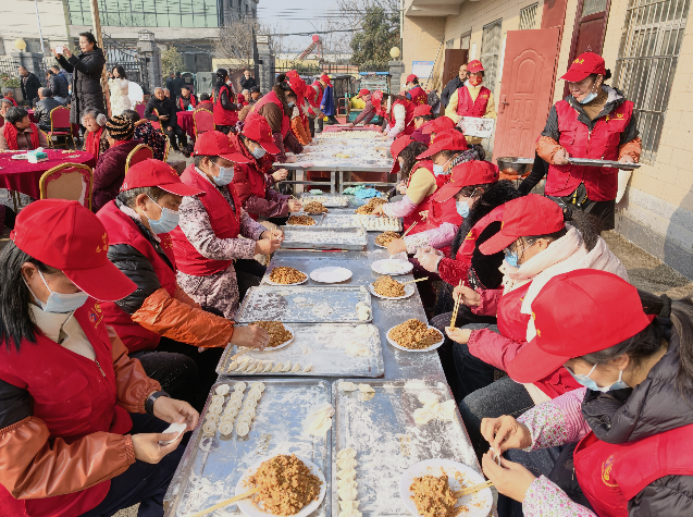 活动现场,100多位老人满脸笑容,围坐在10张圆桌旁,沉浸在志愿者们带来的精彩戏曲表演中。与此同时,其他志愿者们分工明确、配合默契,有的熟练地和面,有的专注地擀着饺子皮,大家齐心协力包饺子,欢声笑语回荡在整个场地。临近中午时分,经过志愿者们一番忙碌,一锅锅热气腾腾、香气扑鼻的饺子新鲜出锅,被端上了餐桌。老人们围坐在一起,一边品尝着美味的饺子,一边愉快地聊着家常,现场气氛温馨而欢乐。