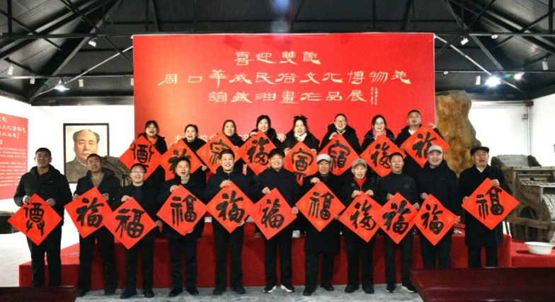 项城市德高民俗博物馆的馆员们为观看油画展的观众表演了民俗节目,书法家许东方、刘广岩、游富华现场挥毫泼墨,为观众题写福字,以表达新年祝福。
