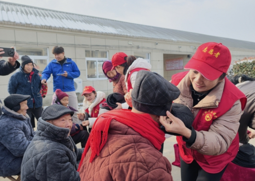 在商水县汤庄乡敬老院,志愿者们将一顶顶厚实的棉帽细心地戴在老人头上,递上贴心的温暖。志愿者们还为老人带来了速冻饺子,热气腾腾的饺子端上桌,包含着对老人真诚的祝福。活动现场,志愿者们蹲下身,为40多位老人细心修剪指甲;互动游戏环节,看着志愿者们精彩的表演,老人们开心得像个孩子,笑声不断。尊老敬老的传统美德,在这一刻化作了最温暖的志愿实践。