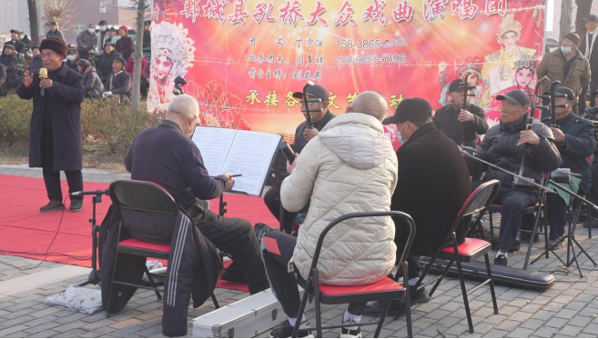 冬日午后,郸城县城内孔桥桥边传来阵阵悠扬弦乐,不少老年戏迷围坐一起,专注欣赏孔桥大众戏曲演唱团的演出。