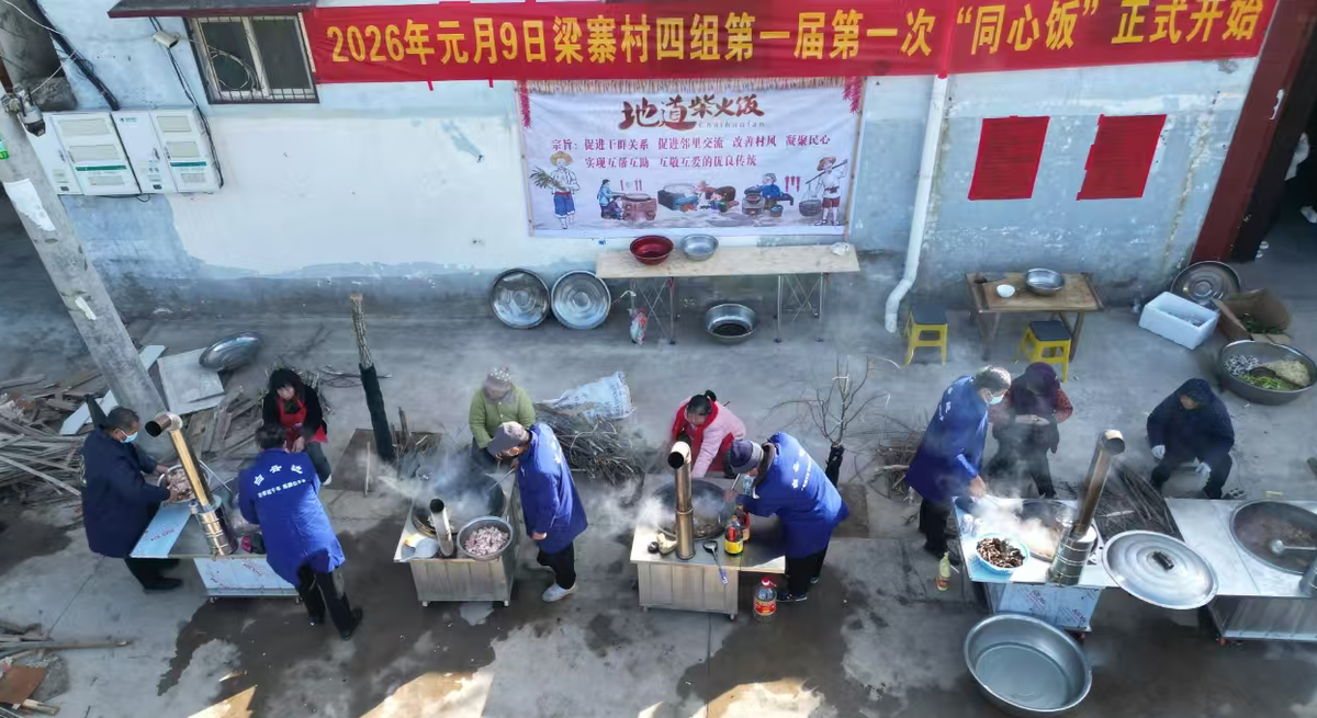 1月9日,梁寨村四组的400多位村民齐聚一堂,围坐在热气腾腾的大锅旁,共享一顿充满乡情的“同心饭”。其乐融融的场景,勾勒出一幅和美乡村的动人画卷。