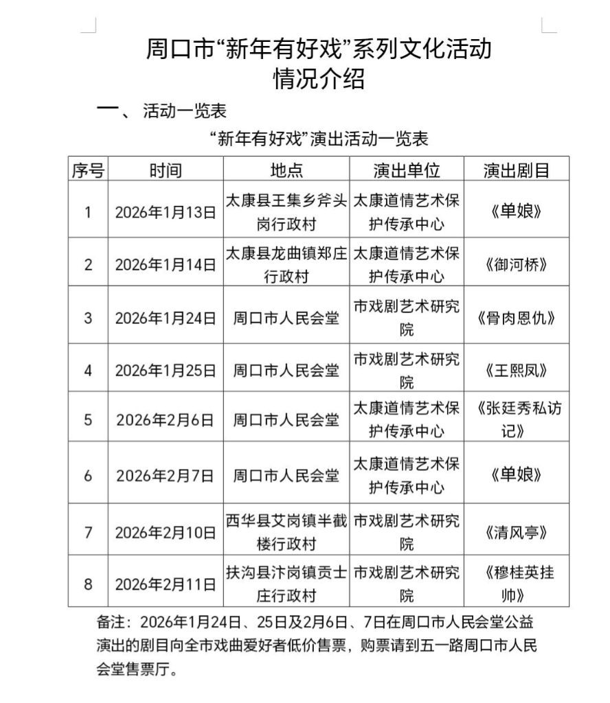 本台讯 由中共周口市委、周口市人民政府主办的“新年有好戏”系列文化惠民活动第二轮演出正在火热进行中。继1月13日、14日《单娘》《御河桥》两部优秀剧目在太康县王集乡、龙曲镇完成公益下乡演出后,1月24日起,剩余6场演出将陆续登场,涵盖剧场惠民与公益下乡两大板块,为市民及基层群众持续送上兼具传统经典与时代精神的文化盛宴。