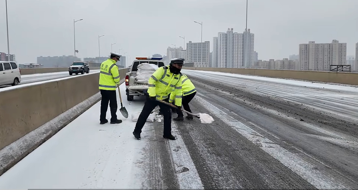 执勤交警顶风冒雪,坚守在城区主干道、桥梁、坡道弯道等事故易发路段,引导过往车辆减速慢行、保持安全车距、有序通行。在危险路段和事故多发区域,执勤交警密切配合,同步开展融雪除冰作业,精准投放融雪剂,加速路面积雪融化,有效降低路面结冰风险,用实际行动为群众排忧解难。