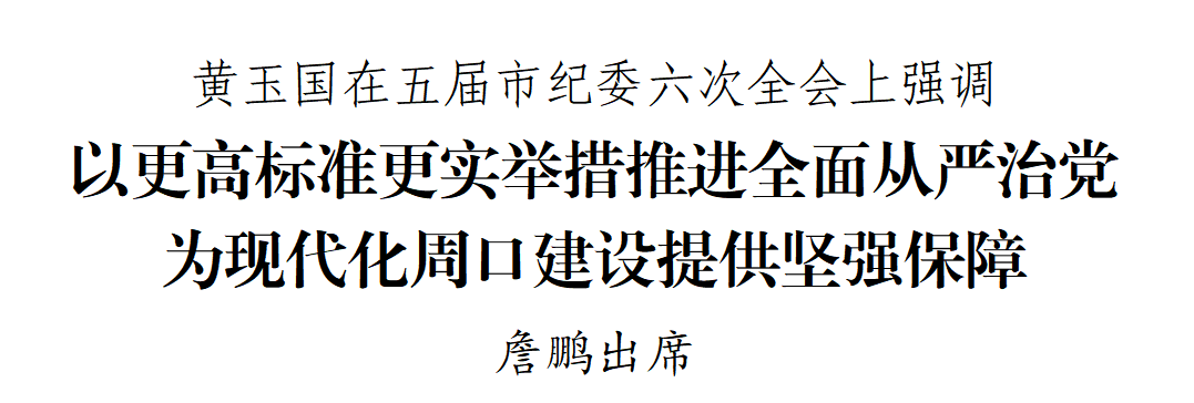 本台讯 1月23日,中国共产党周口市第五届纪律检查委员会第六次全体会议召开,深入贯彻党的二十大和二十届历次全会精神,全面落实二十届中央纪委五次全会和十一届省纪委六次全会部署,总结去年工作,分析当前形势,安排今年任务,以更高标准、更实举措推进全面从严治党,为实现“十五五”时期目标任务、奋力谱写中原大地推进中国式现代化周口新篇章提供坚强保障。市委书记黄玉国出席并讲话。市长詹鹏出席。省纪委监委有关同志到会指导。