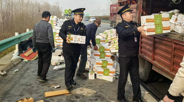 在保障现场安全的前提下,执法人员始终坚守服务一线,主动安抚司机情绪,了解其身体状况与货物损失,组织执法人员协助货车司机清理散落货物,并帮助司机联系货主与保险公司,最大限度减少其损失。通过高效协作,现场散落货物快速全部清理完毕,受阻路段恢复正常通行,未造成长时间交通拥堵。为避免二次事故、保障春运期间主线畅通,执法人员全程驾驶巡逻车护送事故车辆,安全引导至项城收费站出口,帮助司机妥善处置后续事宜。