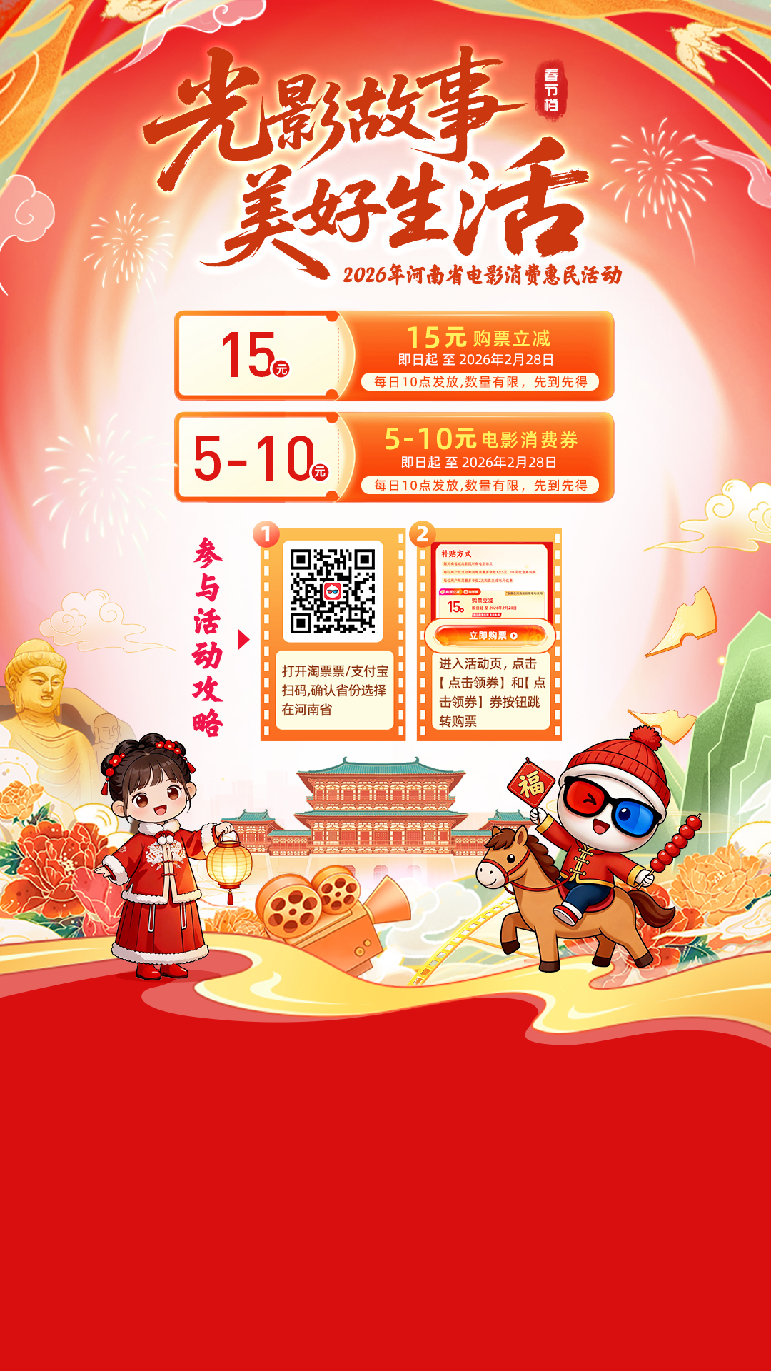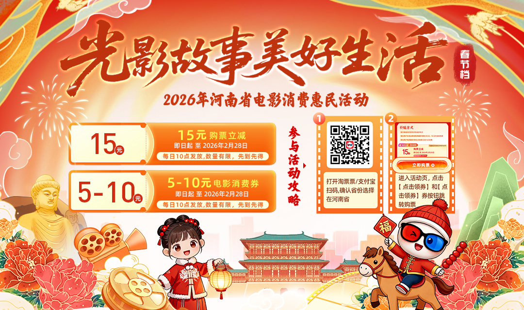 本台讯 2026年马年春节临近,为丰富节日期间群众文化生活,促进电影市场消费,河南省委宣传部(省电影局)联合淘票票平台推出“光影故事 美好生活”观影消费补贴惠民活动,覆盖河南省内所有正常营业影院及春节档全部影片。具体领券规则及操作步骤如下:打开淘票票APP或支付宝,扫码后选择河南省,即可参与领券;15元购票立减券、5-10元电影消费券,均自即日起至2026年2月28日,每日10点发放,数量有限、先到先得。