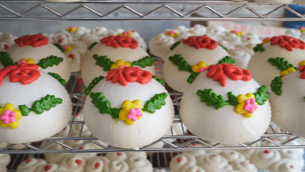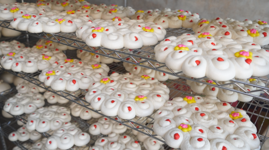 淮阳区特农特运营配送中心负责人王宁说:“在咱豫东地区,初二回娘家,闺女要给父母拿大馍。我们在之前的普通大馍基础上,用果蔬粉和面,又创新做了花大馍,大家可以放心食用,花大馍好看还健康,也比较受欢迎。闺女拿了大馍,父母要给回枣花,之前传统的枣花这种小枣花,有大有小,在此基础上,我们又创新了一下,做了大一点儿的,用果蔬粉带点小花,叫枣山,也挺好看,还比较受欢迎,供不应求。”