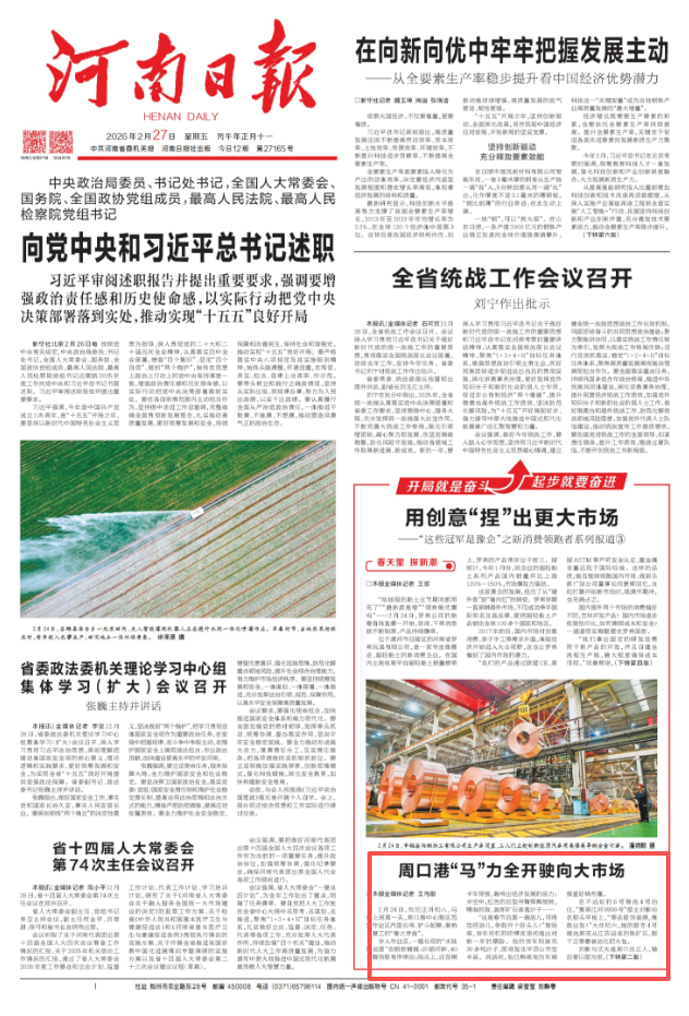 本台讯 2月27日,《河南日报》以《周口港“马”力全开驶向大市场》为题,报道了马年首个工作日,周口港繁忙复工,高效运转,43条国内外航线全面恢复运营的相关情况。具体内容如下: