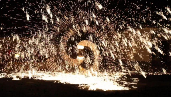 “打铁花”也是不可缺少的元宵节传统民俗活动。在张完乡赵小楼村,非遗“打铁花”也是精彩纷呈。表演者轮番用花棒将铁水击打到空中,形成十几米高的铁花如流星雨般在空中绽放,流光溢彩,场面十分壮观。