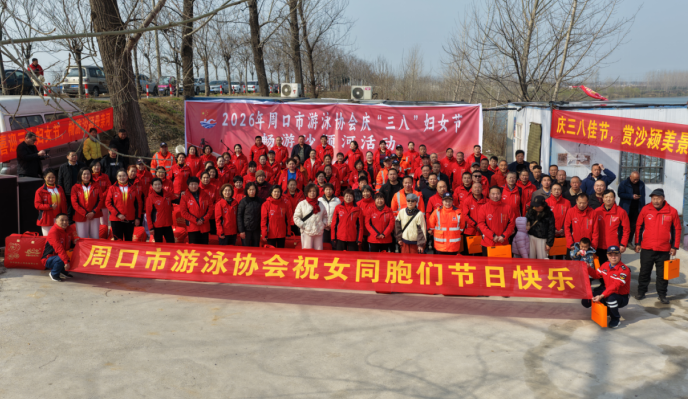 本台讯 春回大地,巾帼焕彩。3月8日,为庆祝第116个“三八”国际妇女节,由周口市教育体育局主办、周口市游泳协会承办的2026周口市游泳协会庆“三八”畅游沙颍河活动在市区沙颍河上游刘庄游泳基地举办。数十名女泳友齐聚母亲河畔,以破浪畅游的独特方式欢度专属节日,展现新时代女性的活力与风采。