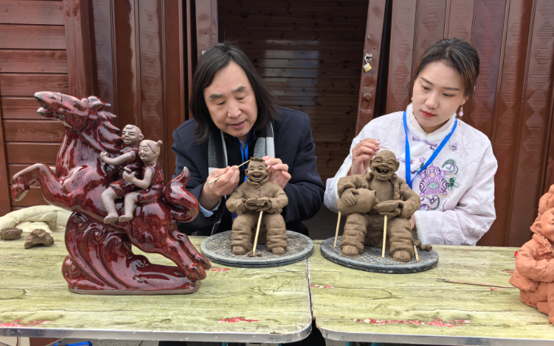“张振福的泥塑乡土气息浓厚,人物表情生动,前几天我过生日当天,朋友特意买的张振福大师的丹钧泥塑《祝寿图》送给我,我非常喜欢,作品表现的是两个儿童抬着一个大仙桃,釉色钧红,丰富厚重,很喜庆。今天我有幸遇见了张大师,再买两件带回去珍藏,我与其泥塑作品产生共鸣,作品能带给我丰厚的情绪价值,”一位来自外地的游客观赏后连连称赞,随手购买了两件张振福泥塑准备带回家珍藏。