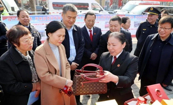 活动现场,“公正司法护航消费安全、能动履职优化营商环境”的横幅高高悬挂,吸引了过往群众的目光。展台前,干警们将案件办理过程中查获的假冒品牌鞋帽、日化用品等各类侵权商品进行了集中展示,通过实物对比、现场讲解的方式,生动形象地向围观群众传授识别假冒注册商标商品的实用技巧,耐心解答大家关于如何辨别真伪、遭遇侵权如何维权等问题,这种直观的普法方式吸引了不少群众驻足观看,现场学习氛围浓厚。