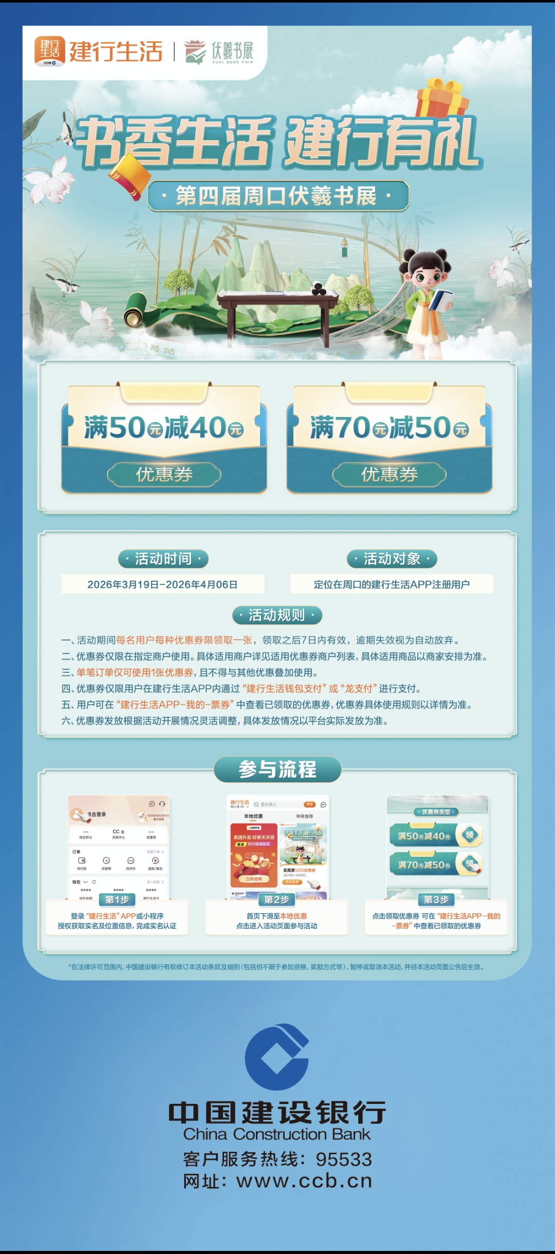 活动时间为2026年3月19日至4月6日,面向定位在周口的建行生活APP注册用户,推出两大购书优惠券:满50元减40元、满70元减50元,每名用户每种优惠券限领1张,领取后7日内有效,数量有限,先到先得。
