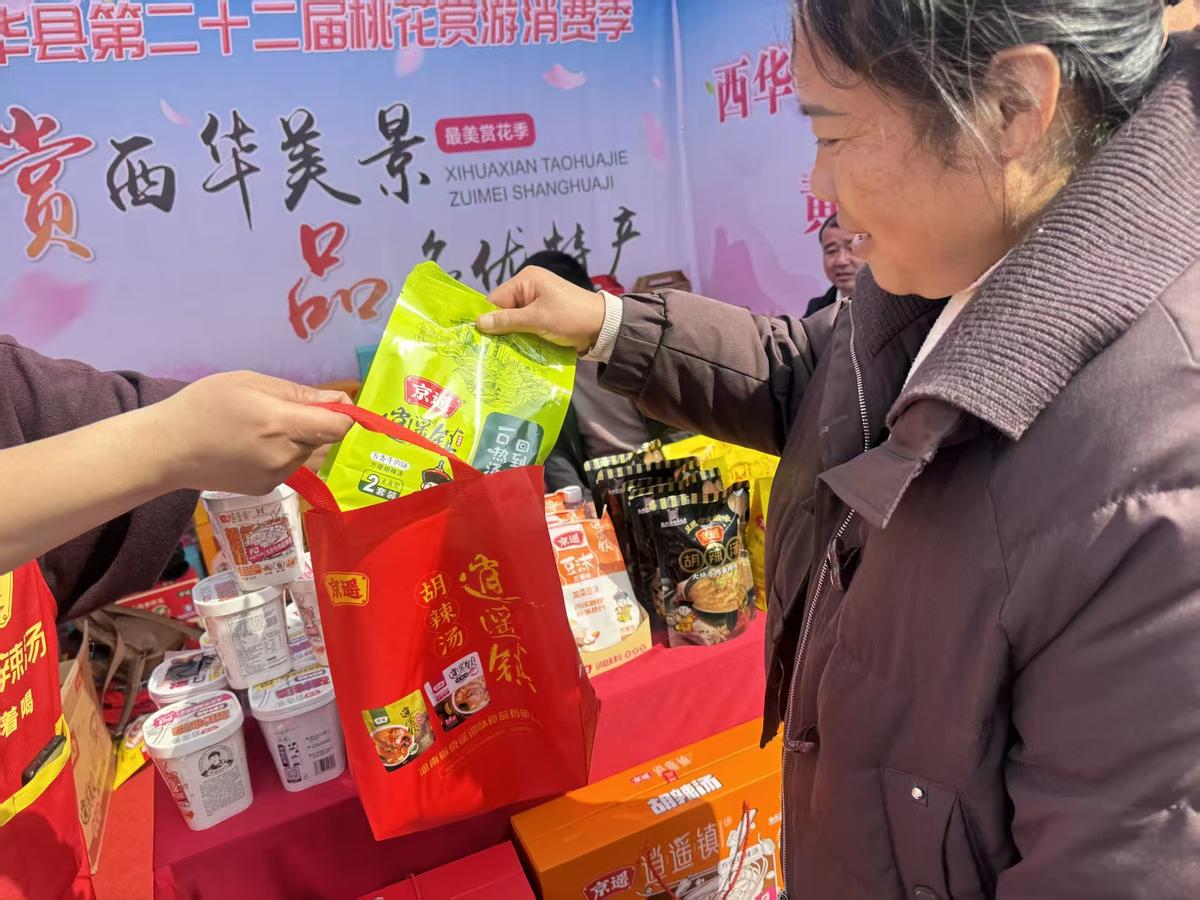 游客的热情选购,点燃了农产品销售热潮。各乡镇紧抓桃花赏游消费季带来的商机,细致展示、真诚推介,让西华地道风味备受青睐,销量持续走高,绘就了“赏花热”带动“销售火”的喜人景象。