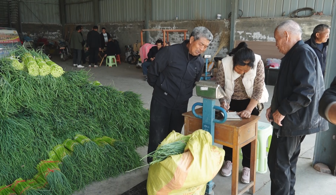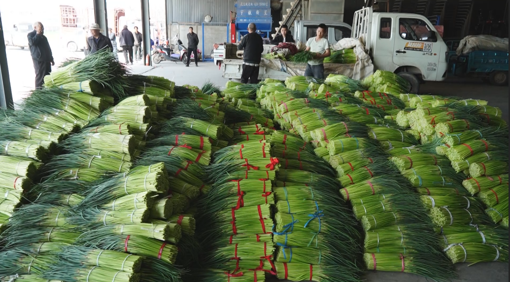 在王店街道家祥农业种植家庭农场的蒜薹交易市场,运送蒜薹的三轮车、小货车排起长队,农户们脸上带着丰收的笑意,将捆扎整齐的蒜薹搬下车。收购商们仔细检查蒜薹的长度、粗细和新鲜度,过秤、记账、付款一气呵成。仓库内,成捆的蒜薹码放得整整齐齐,等待运往全国各地。
