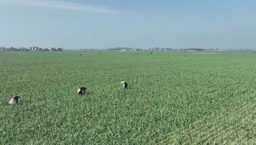 4月7日,记者在刘振屯镇、王店街道等大蒜主产区看到,连片的大蒜田郁郁葱葱,翠绿的蒜薹随风摇曳。蒜农们手持简易工具,娴熟地将蒜薹从蒜苗中抽出,不一会儿就装满了编织袋。