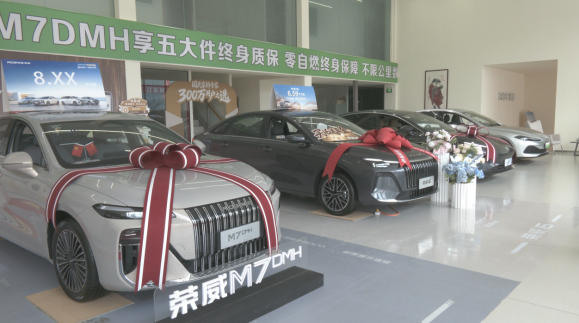 周口和盛荣威4S店总经理刘辉介绍:“这次‘五一’车展我们参展了3款比较有亮点的明星车型,其中有荣威的i6、M7,包括纯电的D6,现在i6可以享受的权益是1千顶1万,还赠送4千元的油补,成功购车以后还能享受1克的黄金,这都是厂家直接送的。另外,M7最低优惠价之后是85800元,它的五大件是终身质保的,荣威纯电的D6,优惠完之后的价格是79800元,续航是450公里。”