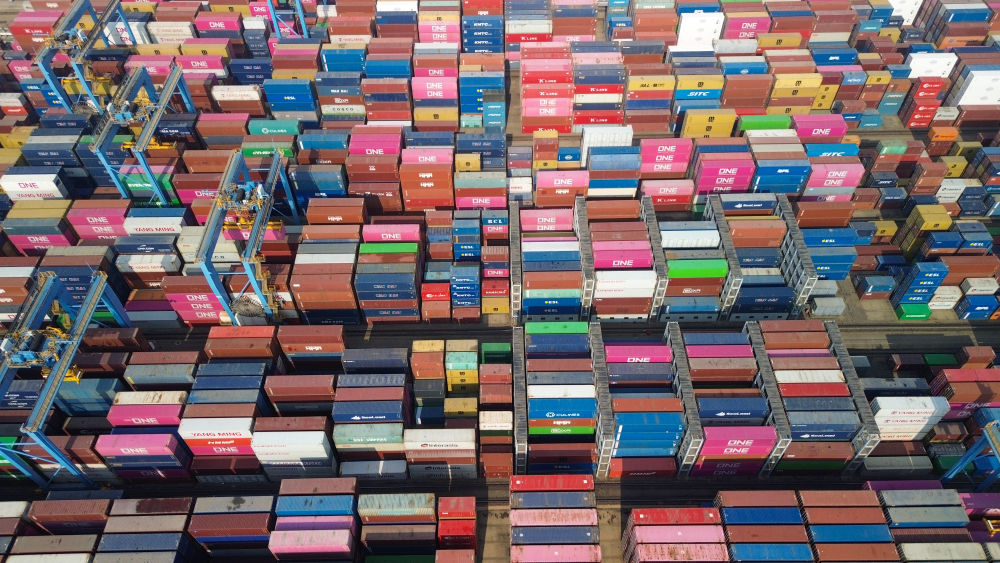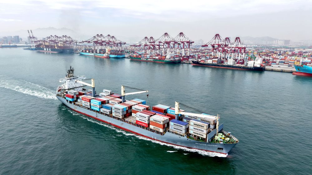 山东港口青岛港,装载外贸集装箱的货轮驶离港口。