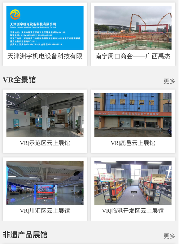 云上展馆依托线上平台,对周口特色产品进行展览展示,打造“永不谢幕的周商大会”。云上展馆分为商会展馆、VR全景馆、非遗文创展和特色产品馆四个板块,通过VR虚拟场景及视频、文字、图片等方式,将各地周口商会的代表企业和各县(市、区)的特色产品进行全方位展示,让市民可以身临其境地参观各企业情况,足不出户了解相关产品,提高市民的体验感和参与感。