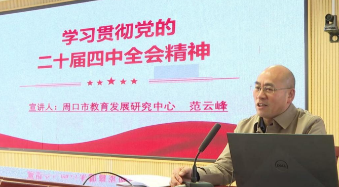 本台讯 为推动党的二十届四中全会精神在基层落地生根,12月10日,学习贯彻党的二十届四中全会精神市委宣讲团走进扶沟县第二高级中学,市委宣讲团成员、市教育发展研究中心副主任范云峰作专题宣讲报告。