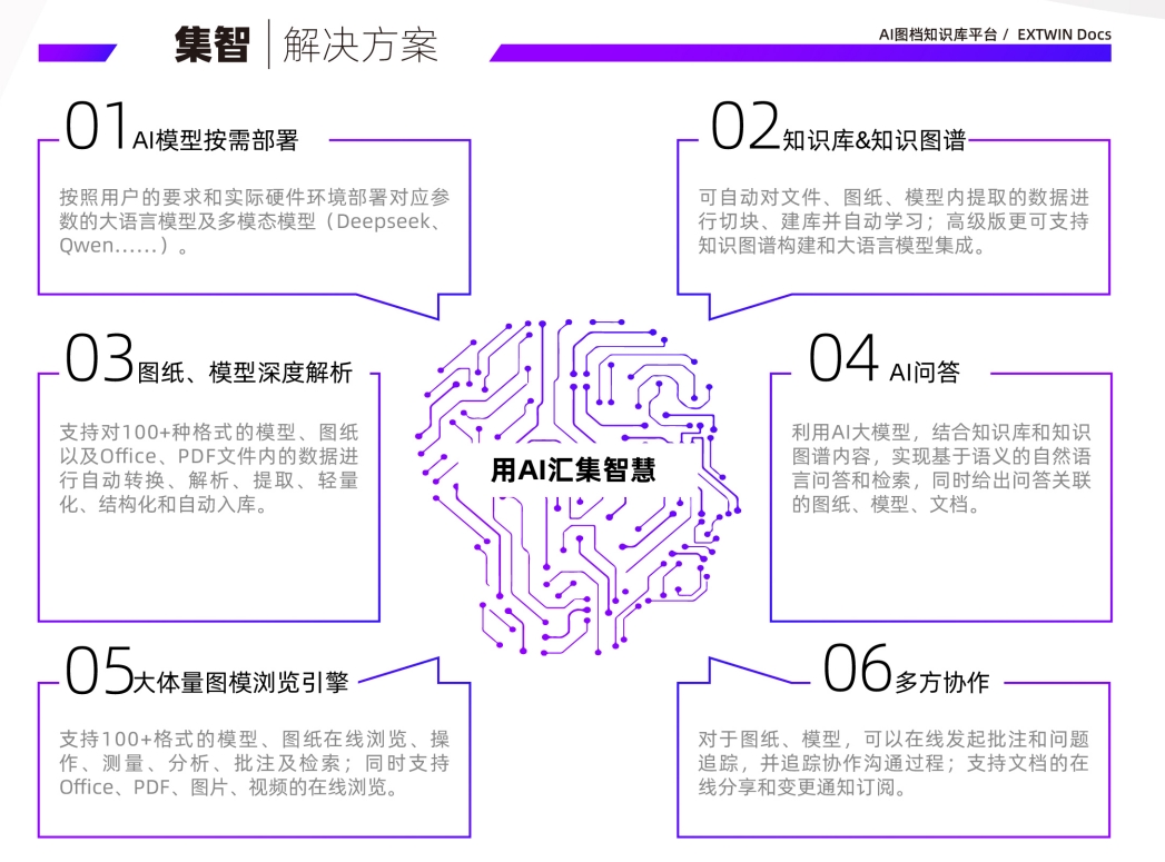 渗透工程企业的图纸、模型是企业的核心资产,如何更好的利用这些资源,是企业知识库搭建的重要一环,随着AI技术逐渐在各行各业的不同领域得到深入应用,如何将AI应用于企业图档资源管理,成为了一个迫切需求,但在目前情况下,大部分的企业知识库只可以实现对文本、图片及Office文件的解析和数据抽取,无法实现推图纸和模型数据的解析,集智(Docs)在这样的背景下应运而生,利用孪界科技在二三维模型解析领域深厚的技术积累,集智(Docs)可以支持对100+种格式的模型、图纸以及Office、PDF文件内的数据进行自动转换、解析、提取、轻量化、结构化,进而实现向量化存储和知识图谱自动构建,结合集成的私有化部署的大模型,结合知识库和知识图谱内容,实现基于语义的自然语言问答和检索,同时给出问答关联的图纸、模型、文档。集智(Docs)中同时集成了灵境(Multiverse)引擎的模型和图纸浏览功能,在快速查找、定位图纸、模型、图档的情况下,可以直接在线浏览、批注和发起问题追踪,搭建起基于图档的多方协作环境。