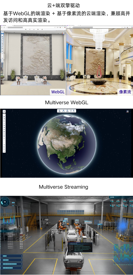 灵境(Multiverse)引擎具备超大体量场景承载能力、数字孪生全要素数据(模型、实景、仿真、GIS……)的的融合能力、高精度模型的极速加载能力、完备的二次开发和集成能力。基于孪界科技独有的“一模双擎”技术框架,使用同一个模型服务,共用模型数据,利用Multiverse WebGL(基于WebGL的孪生引擎)、Multiverse Streaming(云渲染引擎)同时实现基于 WebGL 的端渲染和基于像素流的云渲染,满足不同场景的多端应用需求(大屏、桌面、移动),兼顾高真实渲染和高并发访问的需求,解决了困扰了数字孪生行业多年的端渲染和云渲染选择困难症。