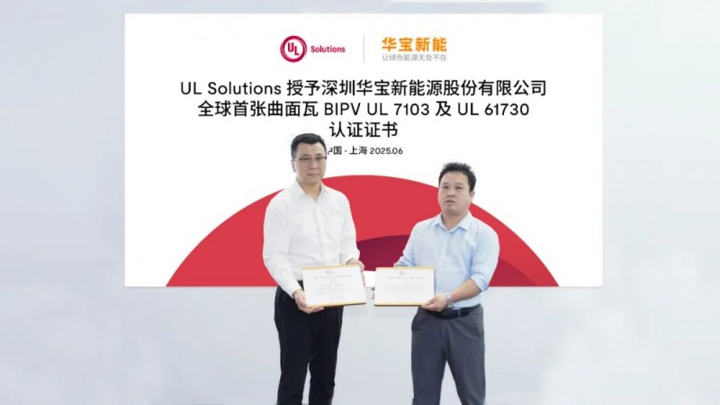 6月12日,在备受瞩目的SNEC第十八届(2025)国际太阳能光伏与智慧能源(上海)大会暨展览会上,国际权威认证机构UL Solutions正式为华宝新能颁发了全球首张曲面光伏瓦BIPV UL 7103认证证书及UL 61370认证证书。这意味着华宝新能美学曲面光伏瓦成为全球首个通过UL 7103严苛测试的曲面光伏瓦产品,其卓越的安全性能、耐用性、发电效能与建筑美学融合度均达到全球行业顶尖水准,为BIPV技术的规模化应用提供了有力支撑。
